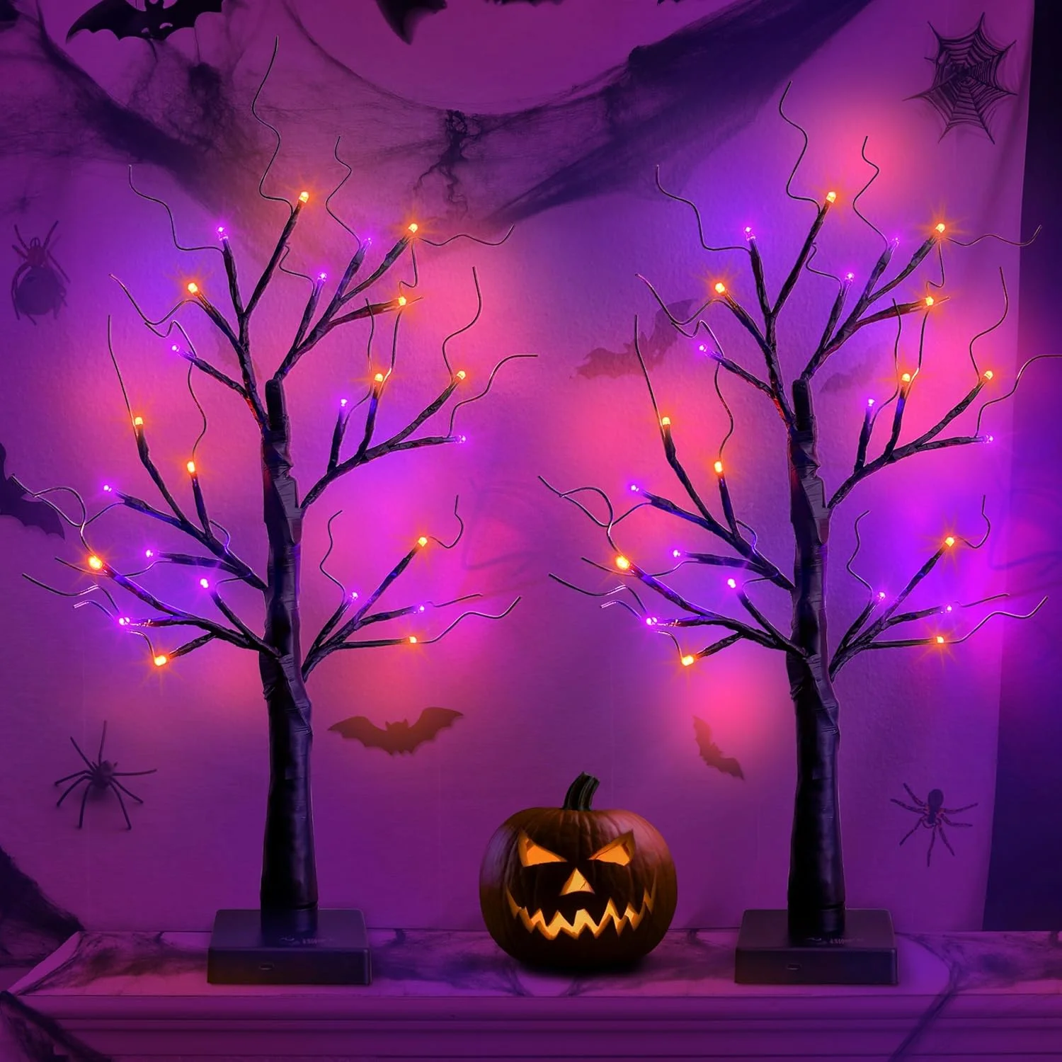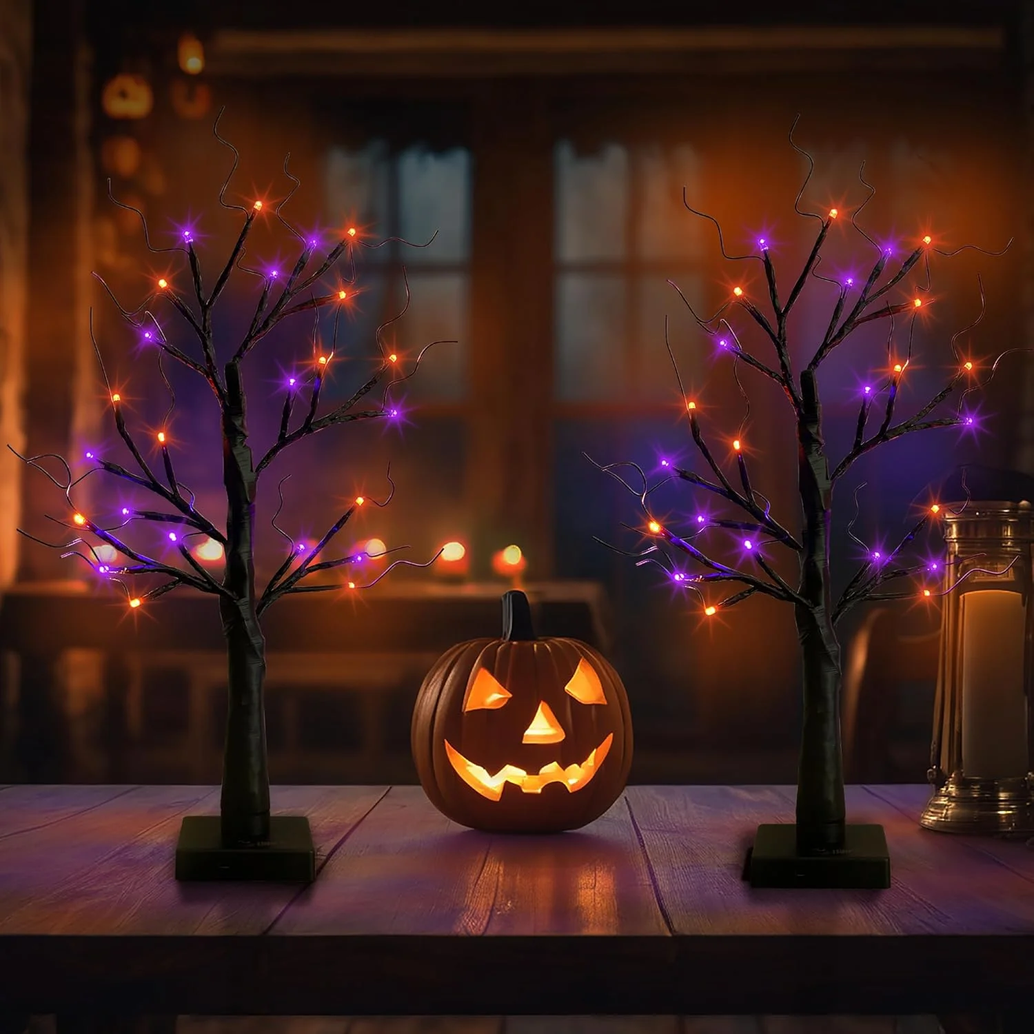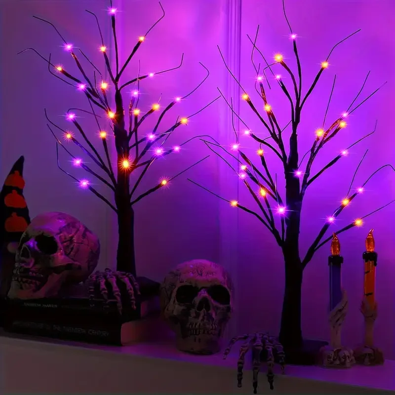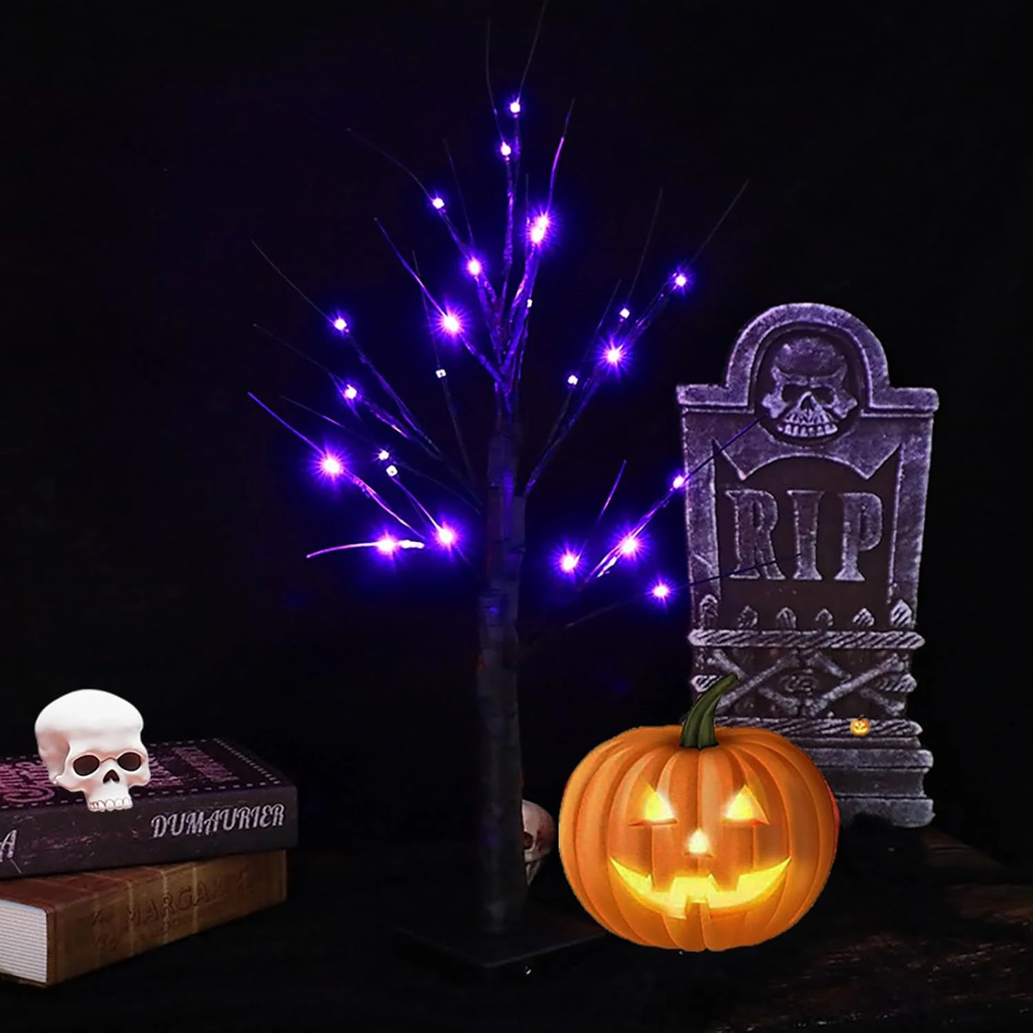 1pc Orange/Purple Glowing Halloween Birch Tree Light with 24L Black Branch Table Lamp Battery&USB For Indoor Holiday Decoration - drollido